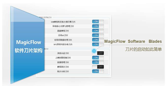 软件刀片可部署在 MagicFlow网关设备, 刀片默认全部提供,用户可以按需开启或关闭。新刀片可通过启用其软件功能而方便地添加;无需额外硬件、固件或驱动程序。根据需要动态部署安全,降低总部署成本。